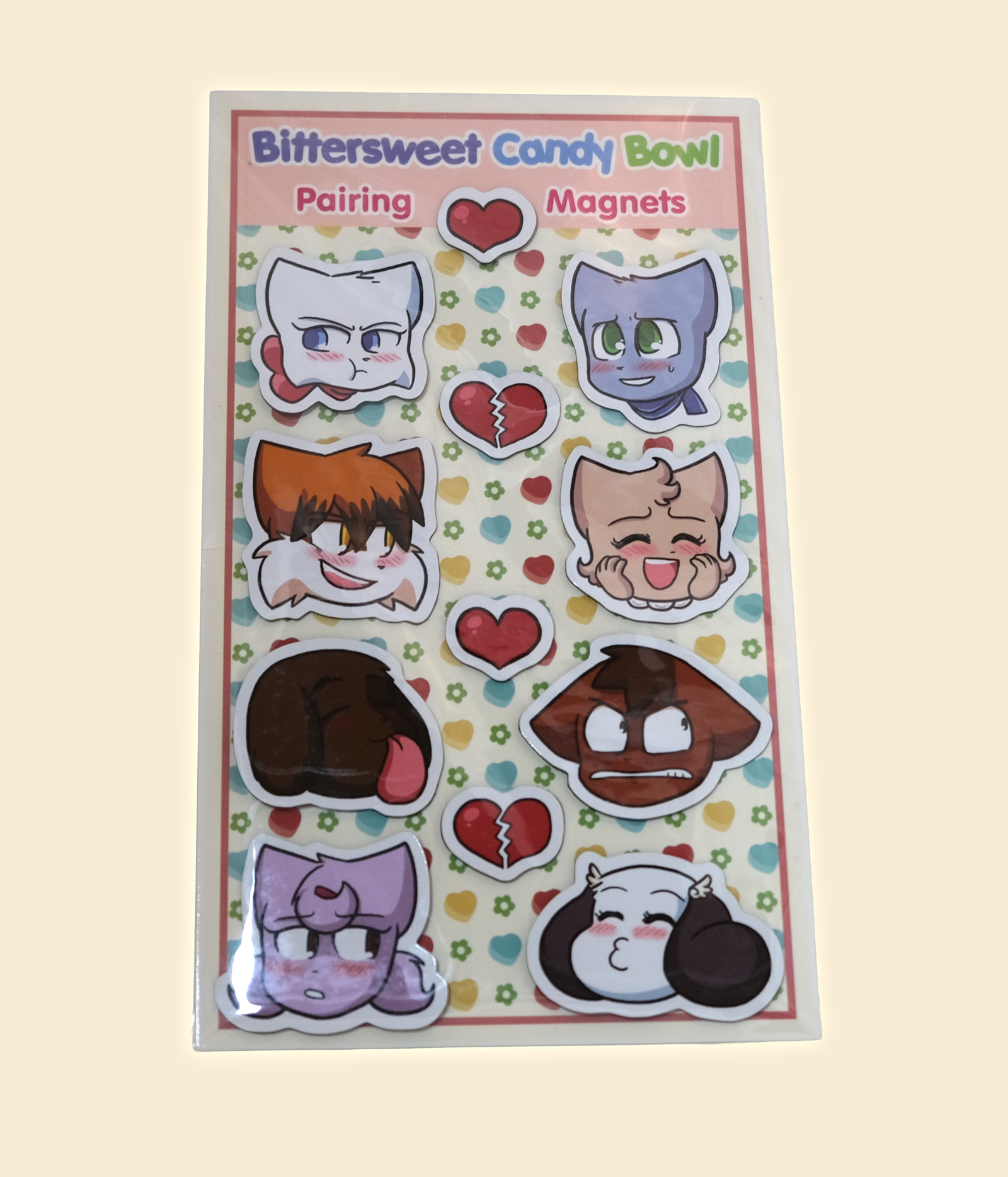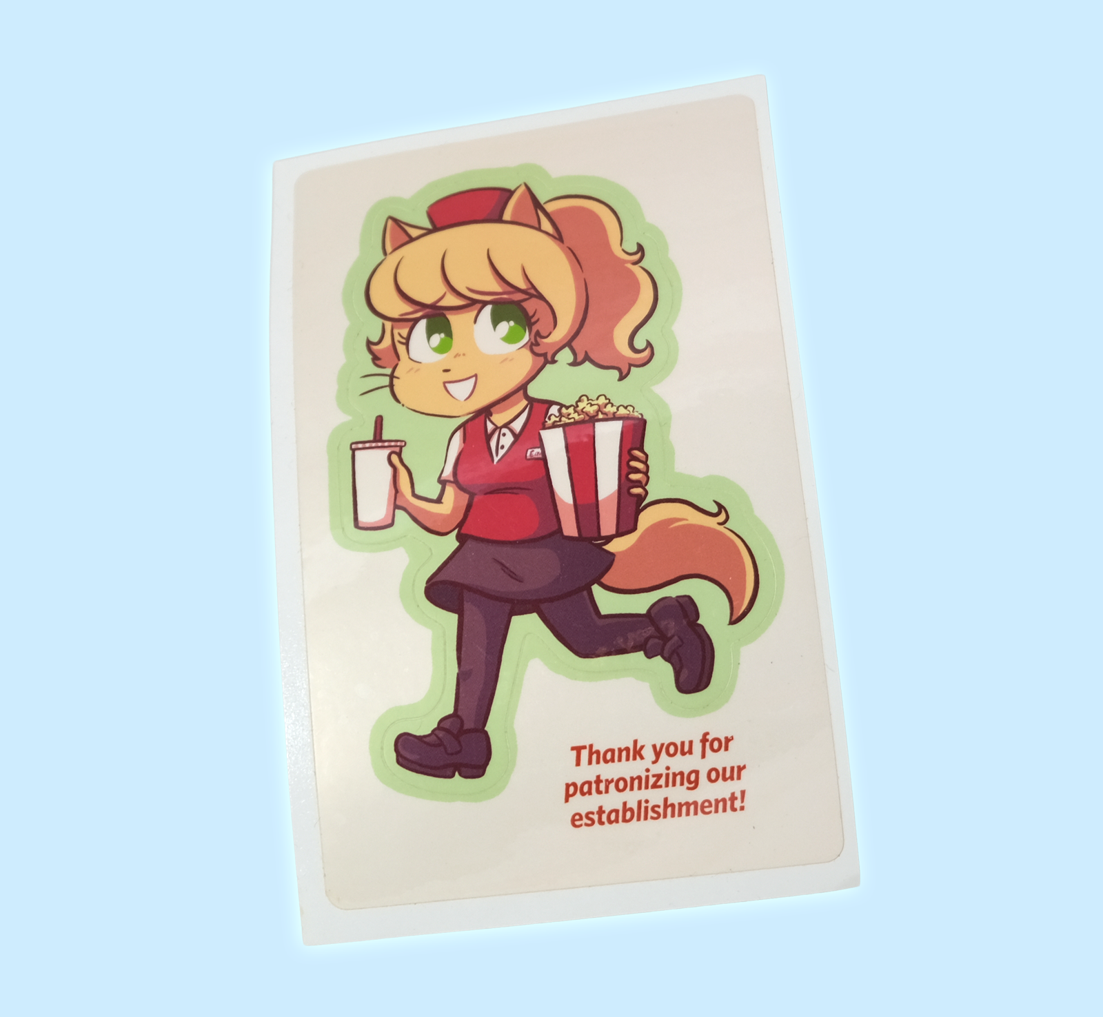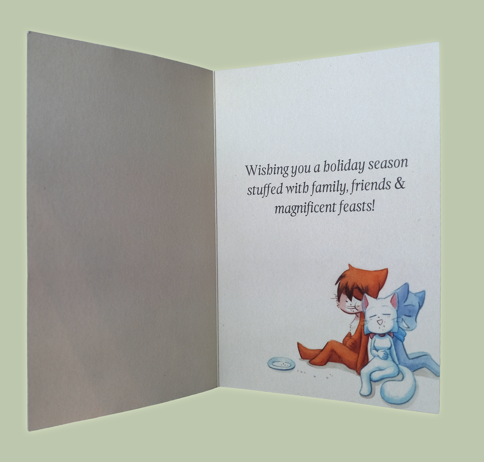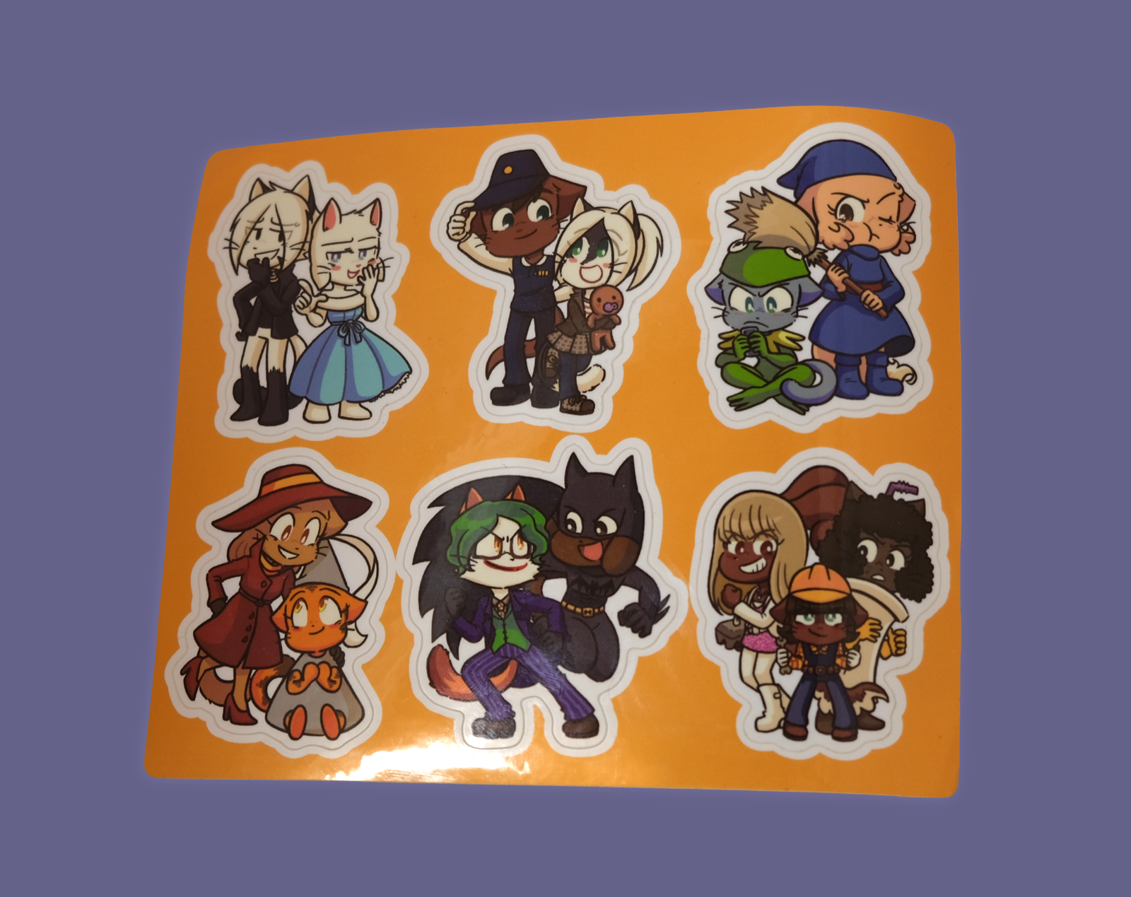 Want flat stuff? We’ve got flat stuff! A set of fridge magnets, an Emma sticker, three of our convention business cards (yes, the school ID ones), a holiday card, a set of four watercolour paintings, halloween themed stickers and omnibus themed stickers.