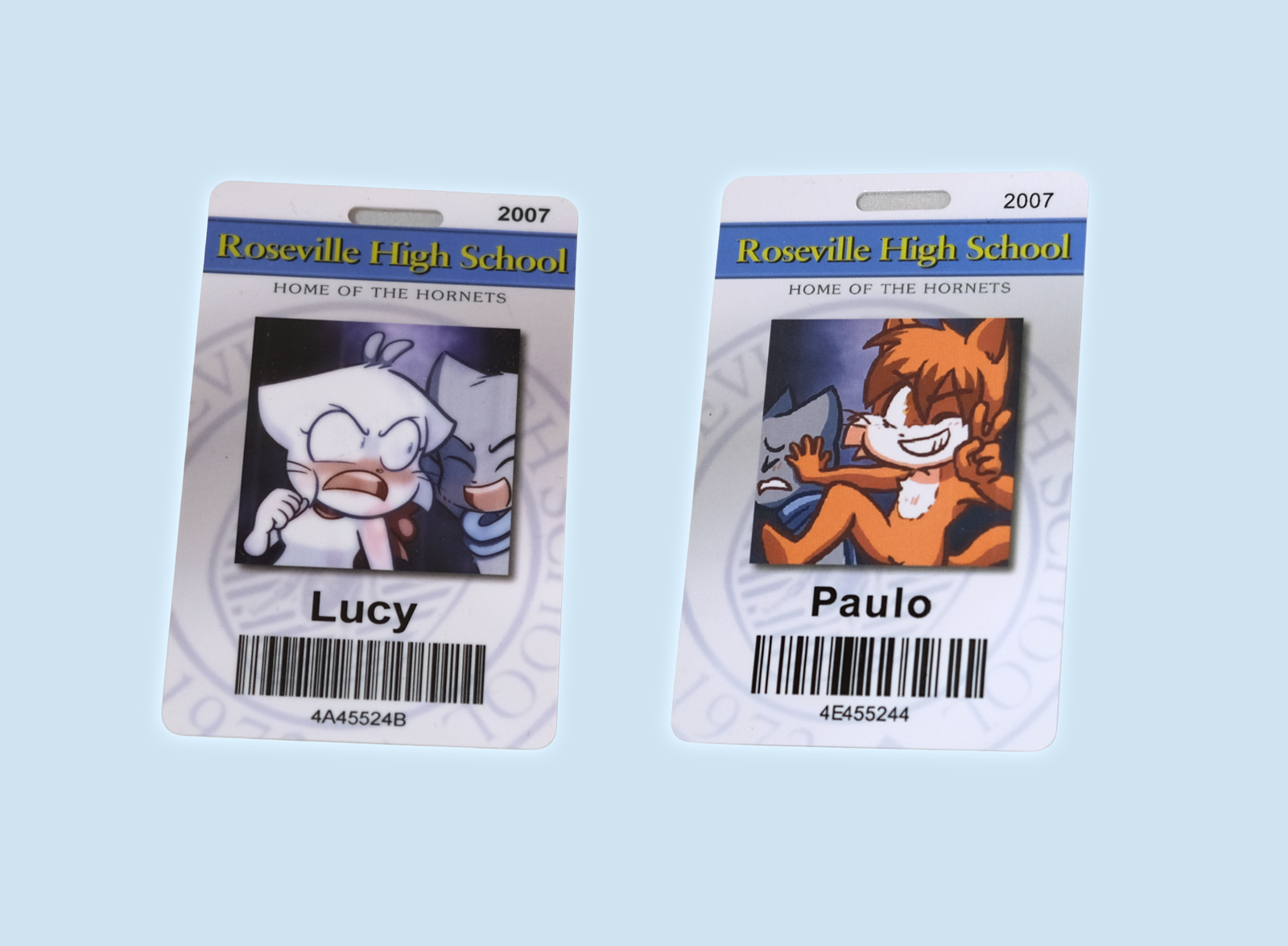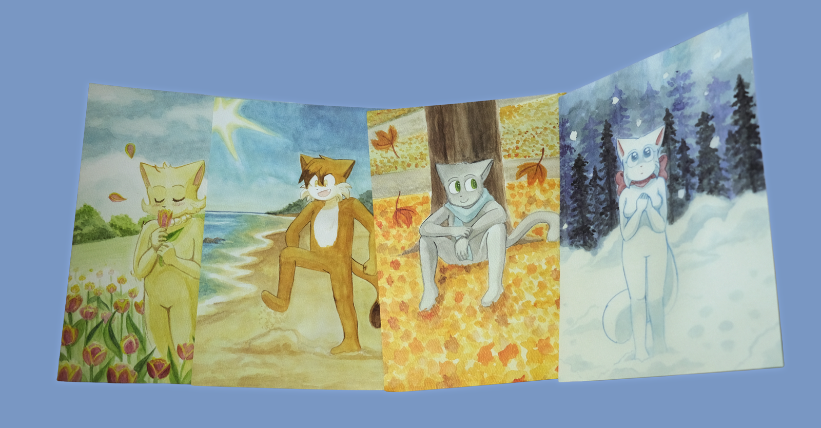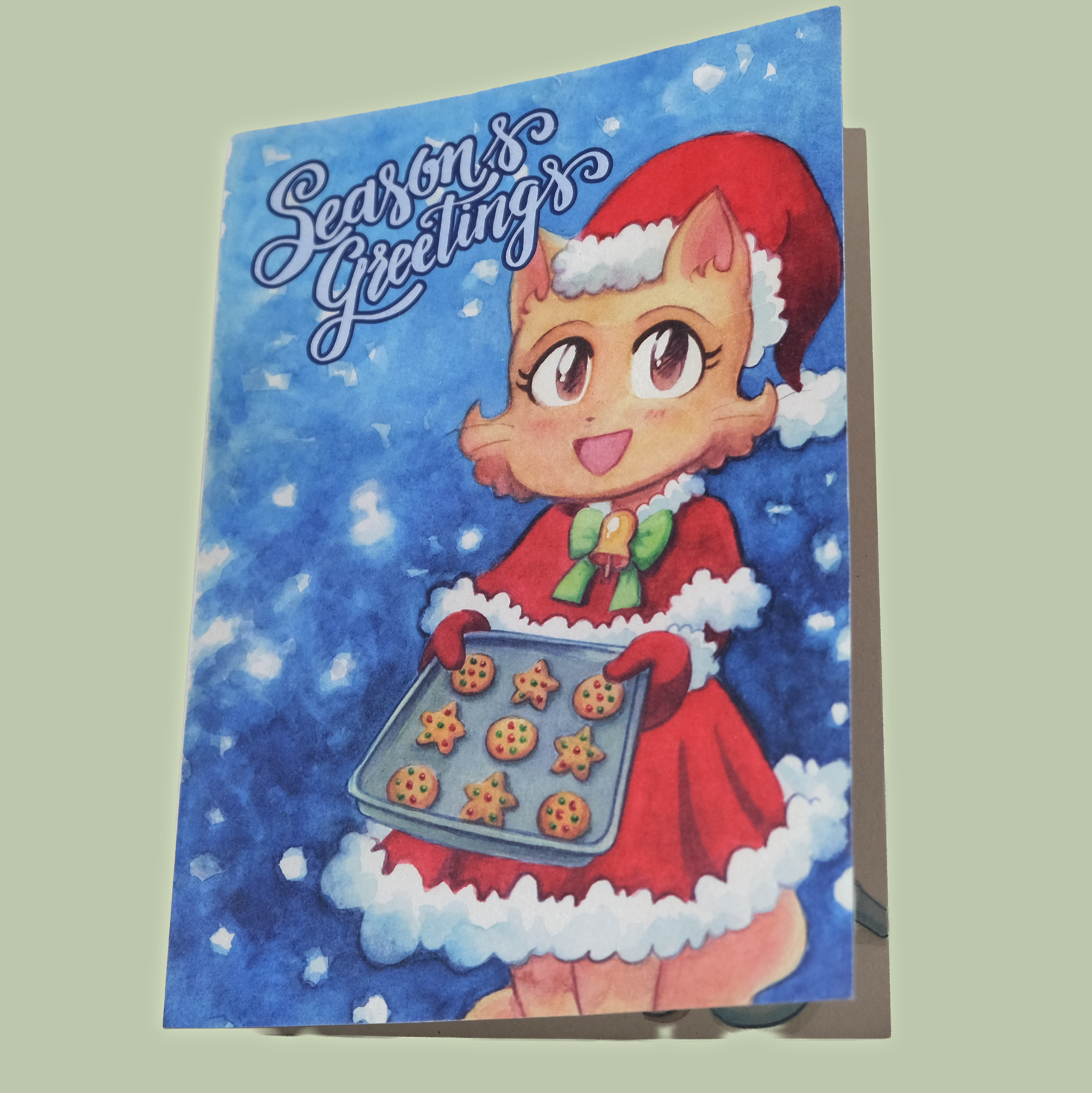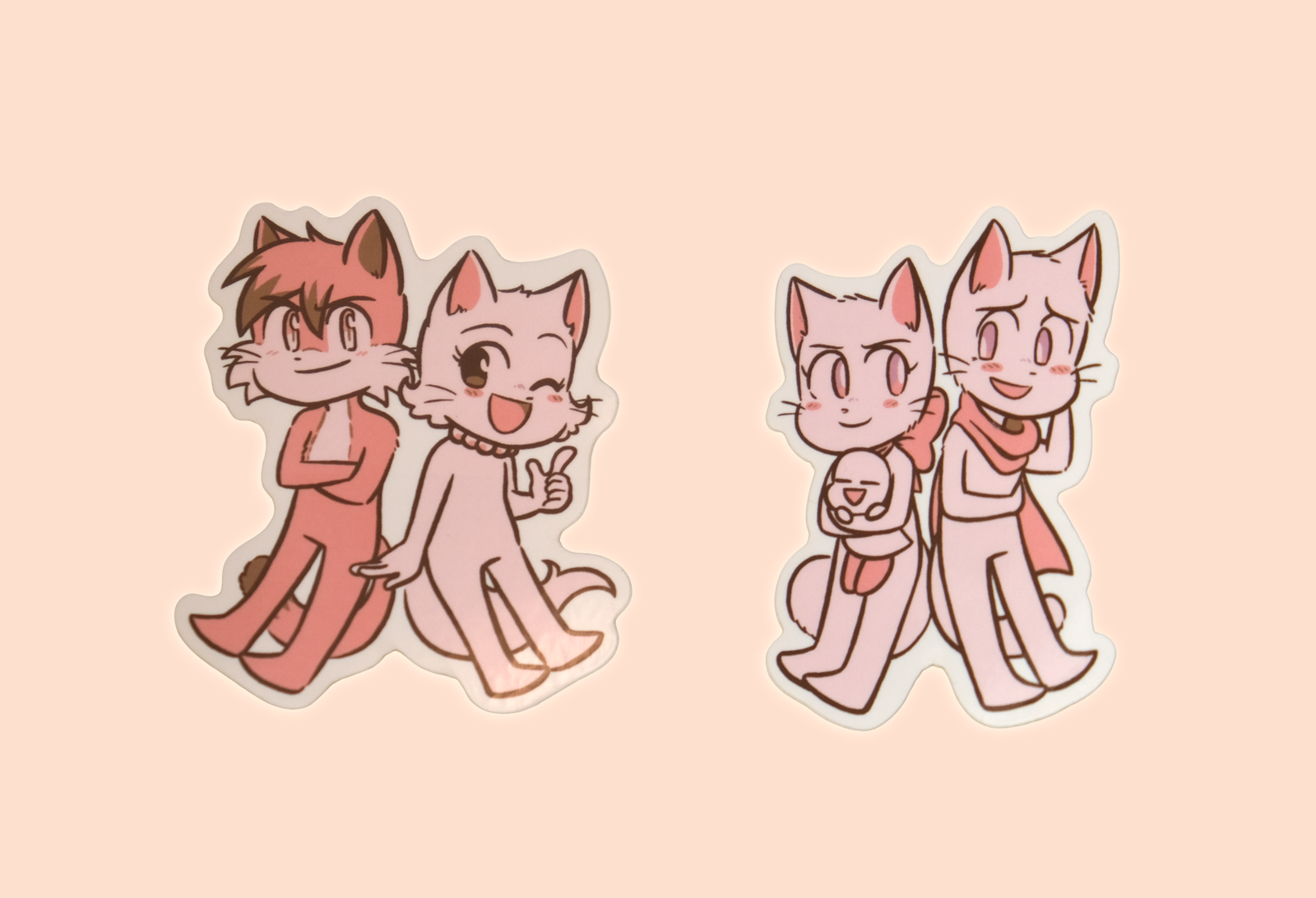 Want flat stuff? We’ve got flat stuff! A set of fridge magnets, an Emma sticker, three of our convention business cards (yes, the school ID ones), a holiday card, a set of four watercolour paintings, halloween themed stickers and omnibus themed stickers.